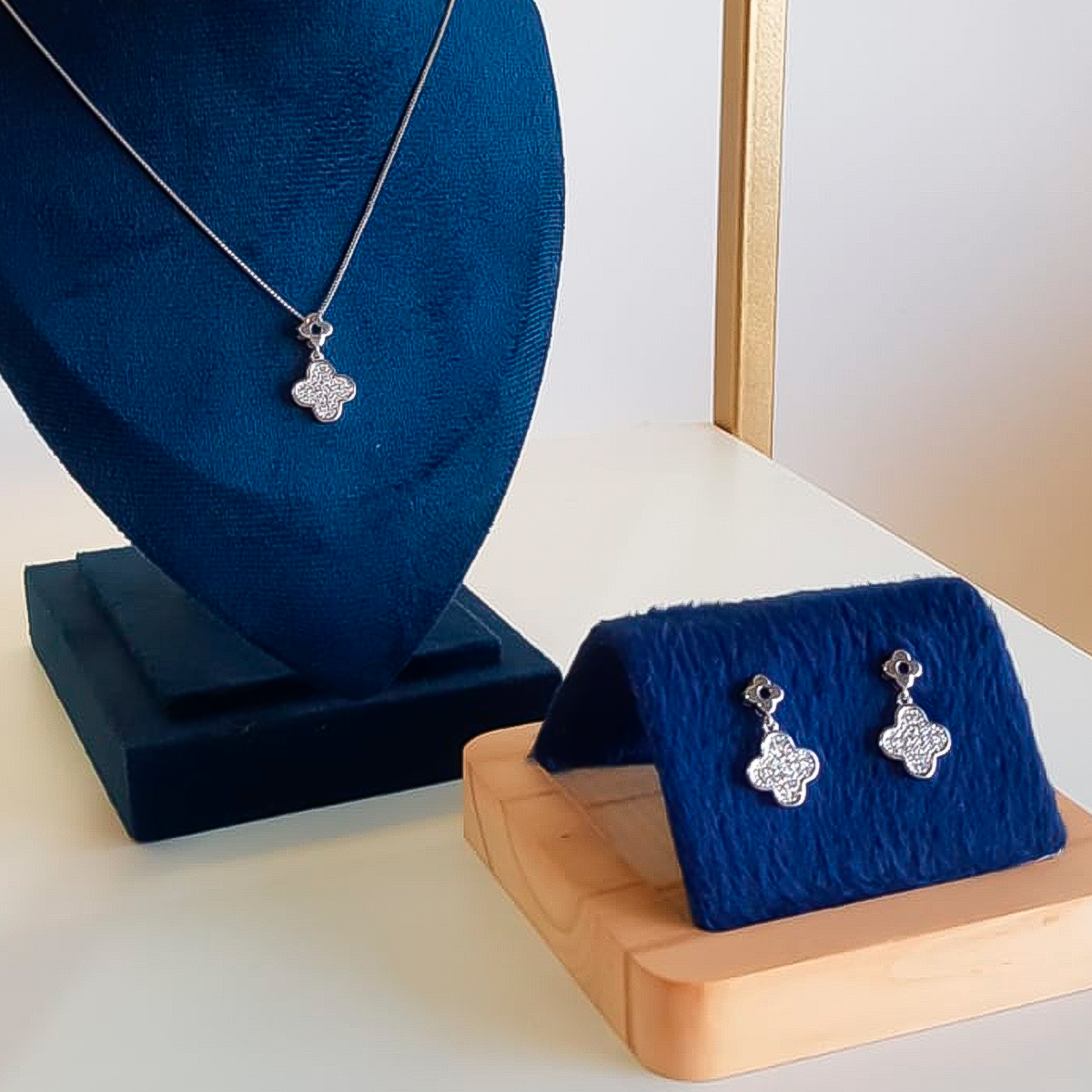 O design do Conjunto Trevo com Flor Cravejado Cristal é uma harmoniosa combinação entre o símbolo do trevo — conhecido por atrair sorte e prosperidade — e a delicadeza da flor, que representa feminilidade, pureza e renovação. Cada detalhe é cravejado com cristais cintilantes que refletem a luz de forma encantadora, dando um toque de sofisticação e destaque sem exageros.